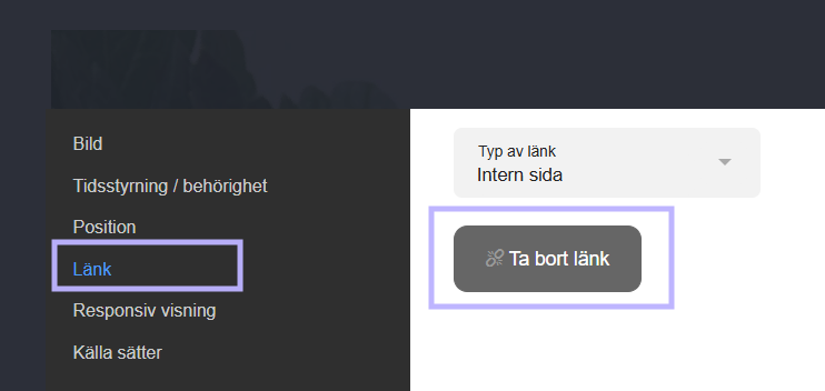 Om du har skapat en länk som du vill ta bort utan att radera bilden så för du muspekaren över bilden som ska avlänkas. Klickar därefter på ikonen “Skiftnyckeln” och därefter på "Inställningar" och sedan på "Ta bort länk" Länken är borta. Glöm ej att spara.