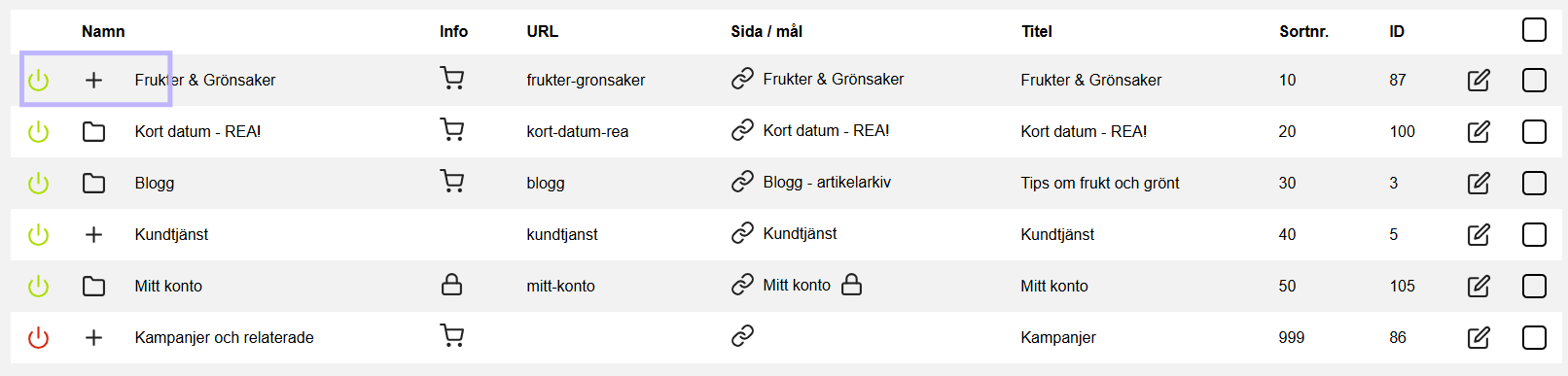När du kommer till översiktssidan så ser du alla huvudnavigeringar. Om den navigering du vill editera är en undernavigering så behöver du först öppna de navigeringar som den är placerad under. Det gör du genom att klicka på namnet på huvudnavigeringen. Om du ser ett plustecken framför en navigering så betyder det att det finns en nivå under.