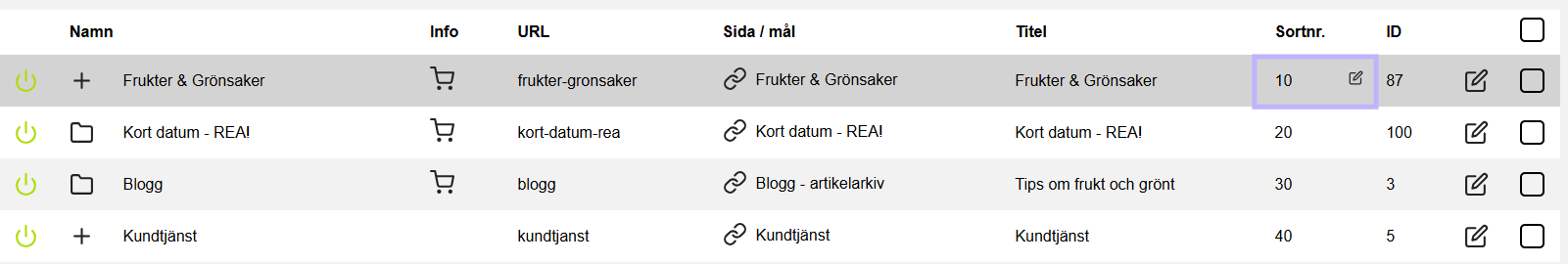 På raden "Sortering" skriver du in en siffra som avgör var i nivån navigeringen ska placeras.