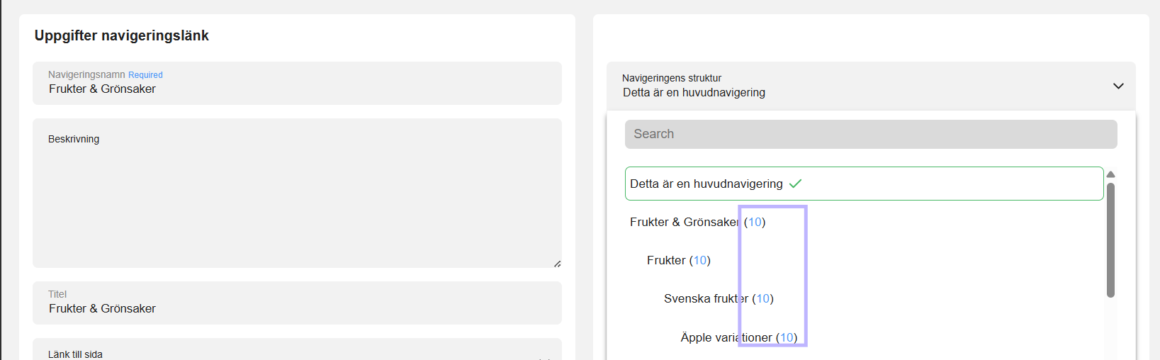I droppen "Navigeringens struktur" väljer du först var i strukturen navigeringen ska visas. Du väljer här vilken navigering du vill lägga navigering du vill ändra under.